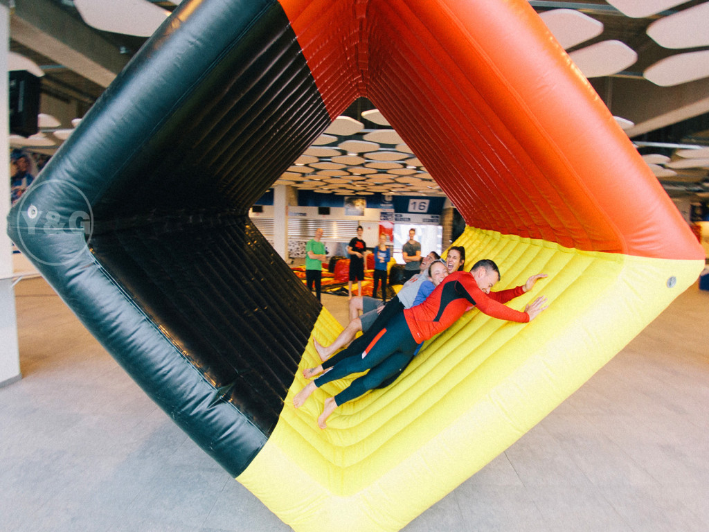 Guys, you ready? The inflatable flip competition is about to start. You need to work together, support each other, to win!